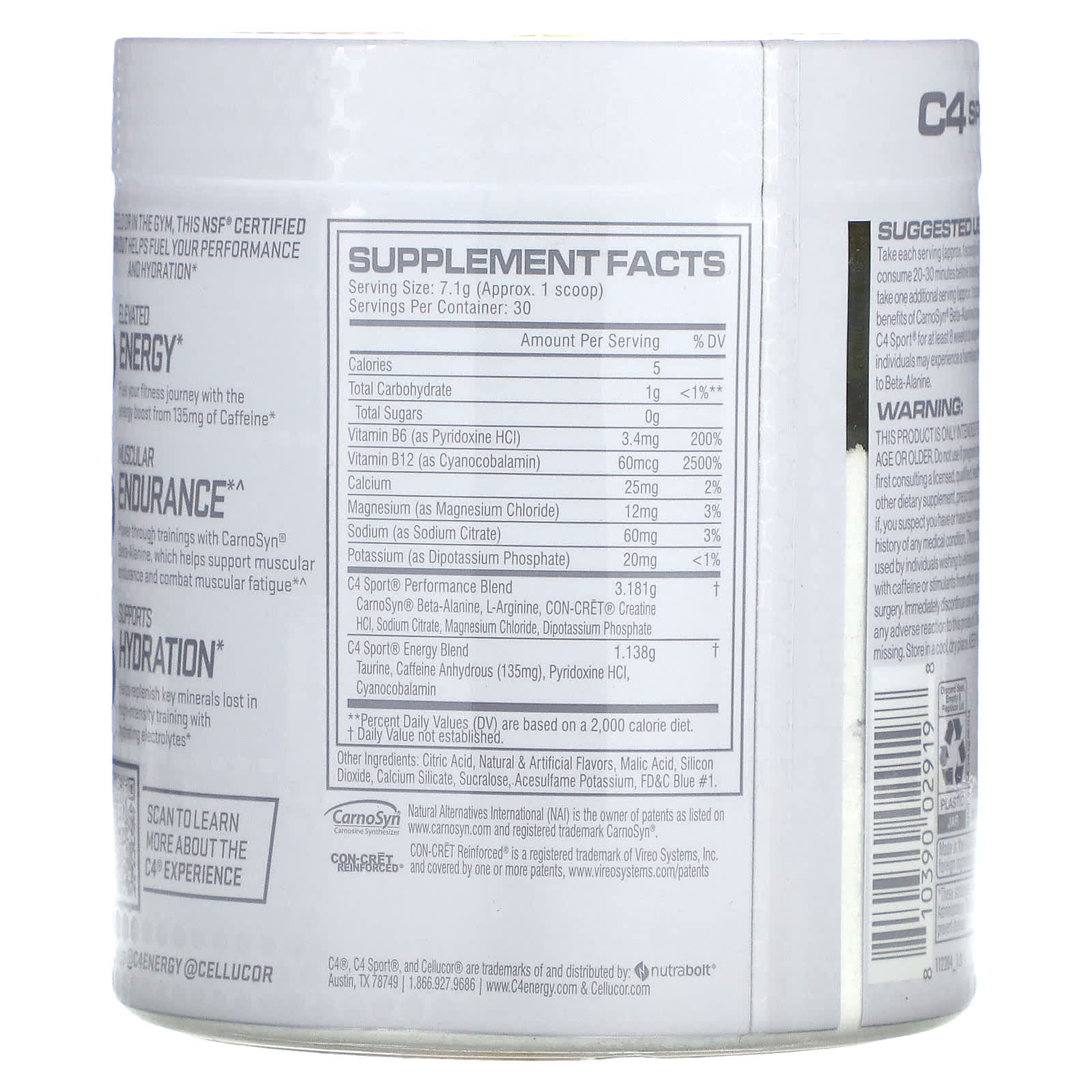 Prenez une portion (environ 1 mesure) de C4 Sport® avec 235 ml d’eau, 20 à 30 minutes avant l’entraînement. Une fois la tolérance évaluée, prenez une portion supplémentaire (environ 1 mesure) avant l’entraînement. ^Des études ont montré que les bienfaits de la bêta-alanine CarnoSyn® sont corrélés à son utilisation cumulative. Prenez C4 Sport® pendant au moins 8 semaines pour profiter au maximum de ses bienfaits. Certaines personnes peuvent ressentir une sensation de picotement sans danger, attribuable à la bêta-alanine.