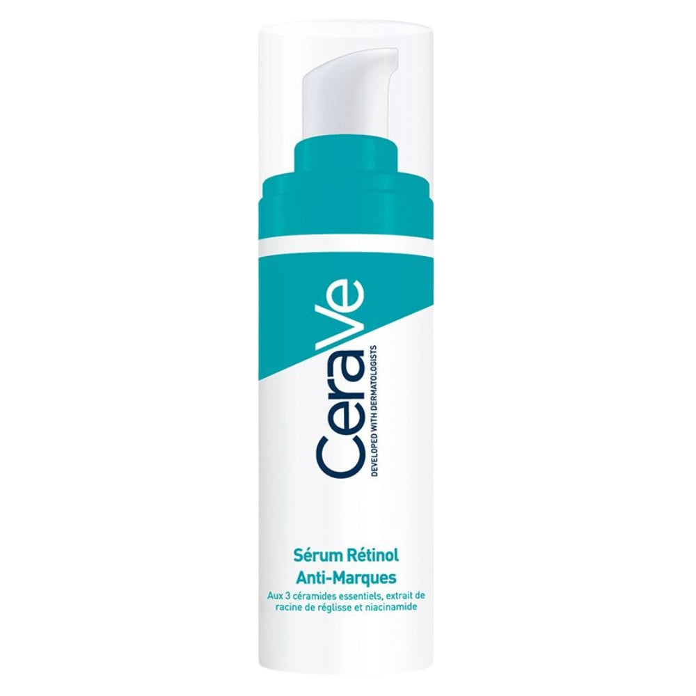 Treatment that tightens pores, smooths skin texture and reduces post-blemish marks CeraVe Retinol Mark Control Serum helps reduce the appearance of marks in blemish-prone and acne-prone skin. This resurfacing treatment reduces the appearance of persistent post-acne marks (post-inflammatory hyperpigmentation or PIH) and tightens pores. Formulated with encapsulated retinol, it resurfaces, smooths, improves skin texture and stimulates cell renewal without irritating. Plus, it contains licorice root extract to brighten, even skin tone and reduce signs of hyperpigmentation. Enriched with 3 essential ceramides, with hyaluronic acid and niacinamide, it deeply hydrates, soothes and restores the skin barrier. Its gel-cream texture quickly penetrates the skin for a non-greasy and non-sticky finish.