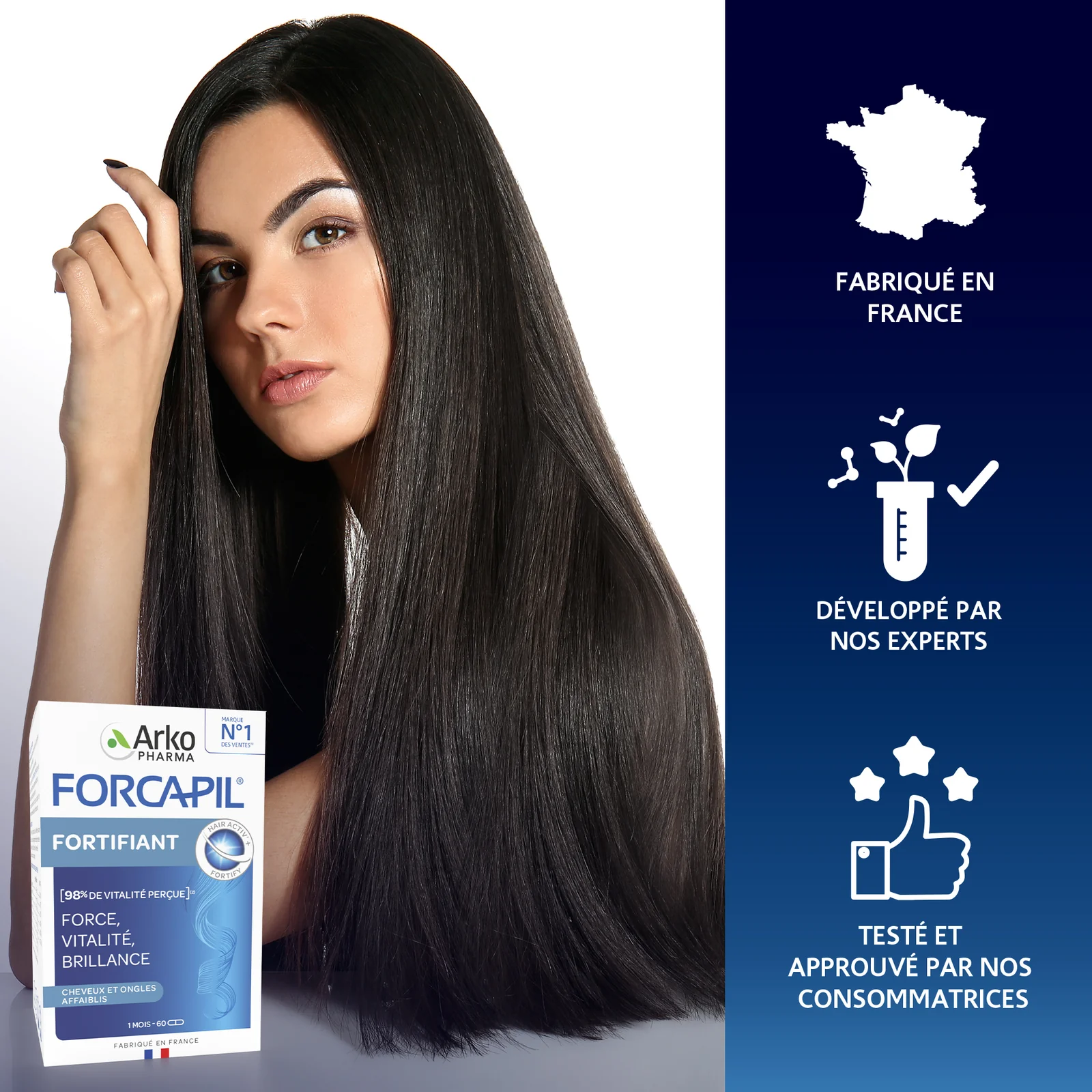 Grâce à sa composition riche en biotine, vitamines B, zinc et acides aminés soufrés, Forcapil aide à stimuler la croissance des cheveux, réduire leur chute et améliorer leur densité et leur brillance. Il contribue également à renforcer les ongles fragiles et cassants.