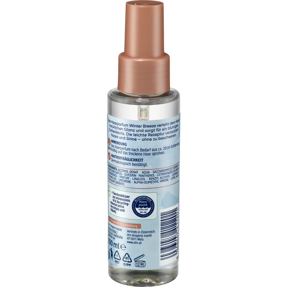 Balea's Winter Breeze hair fragrance gives hair a fresh, floral scent of snowdrops. For natural shine and wonderfully fragrant hair. Formulated without microplastics or purely synthetic water-soluble polymers.