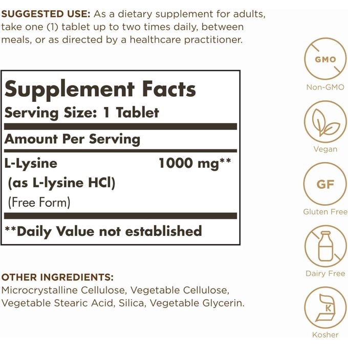 Depuis 1947 Soutien de la peau et des tissus Sans OGM Certifiée sans gluten Sans blé ni produits laitiers Convient aux végans Complément alimentaire La L-lysine est un acide aminé essentiel qui contribue à la santé des tissus de la peau.