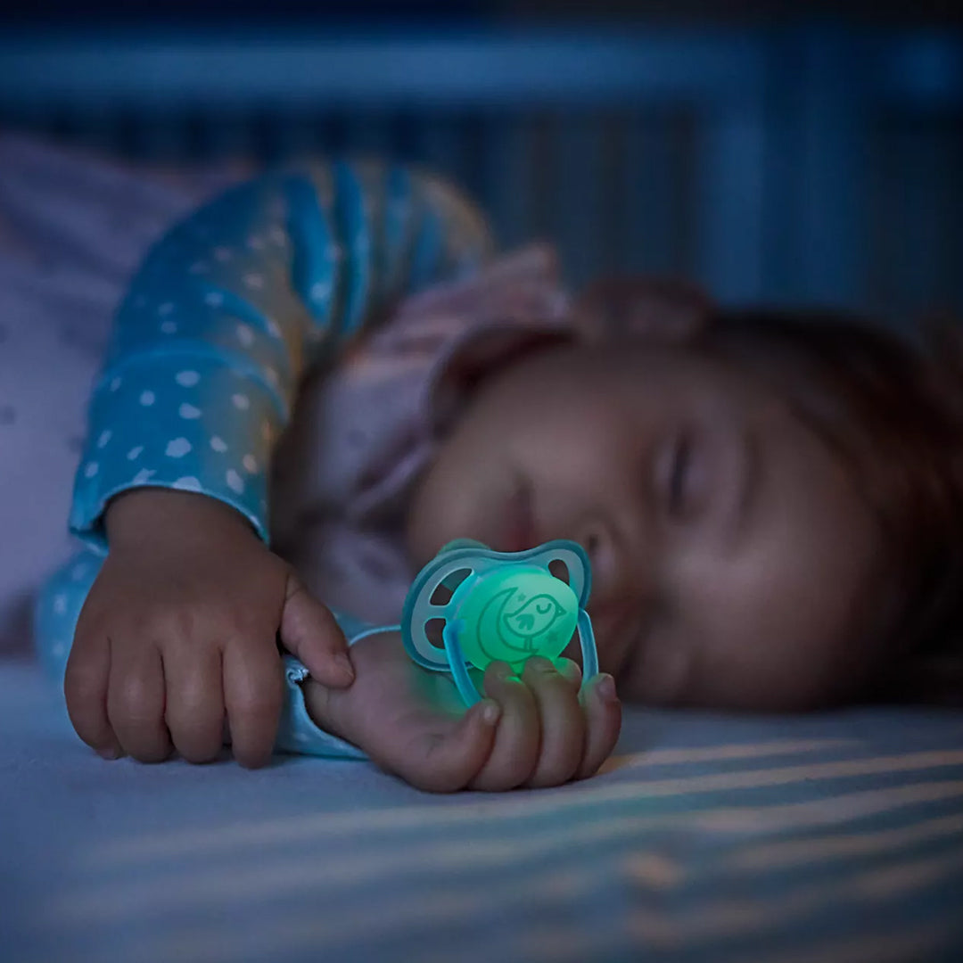 La pastille phosphorescente de la sucette ultra air vous permet de la retrouver rapidement sans avoir à allumer la lumière.