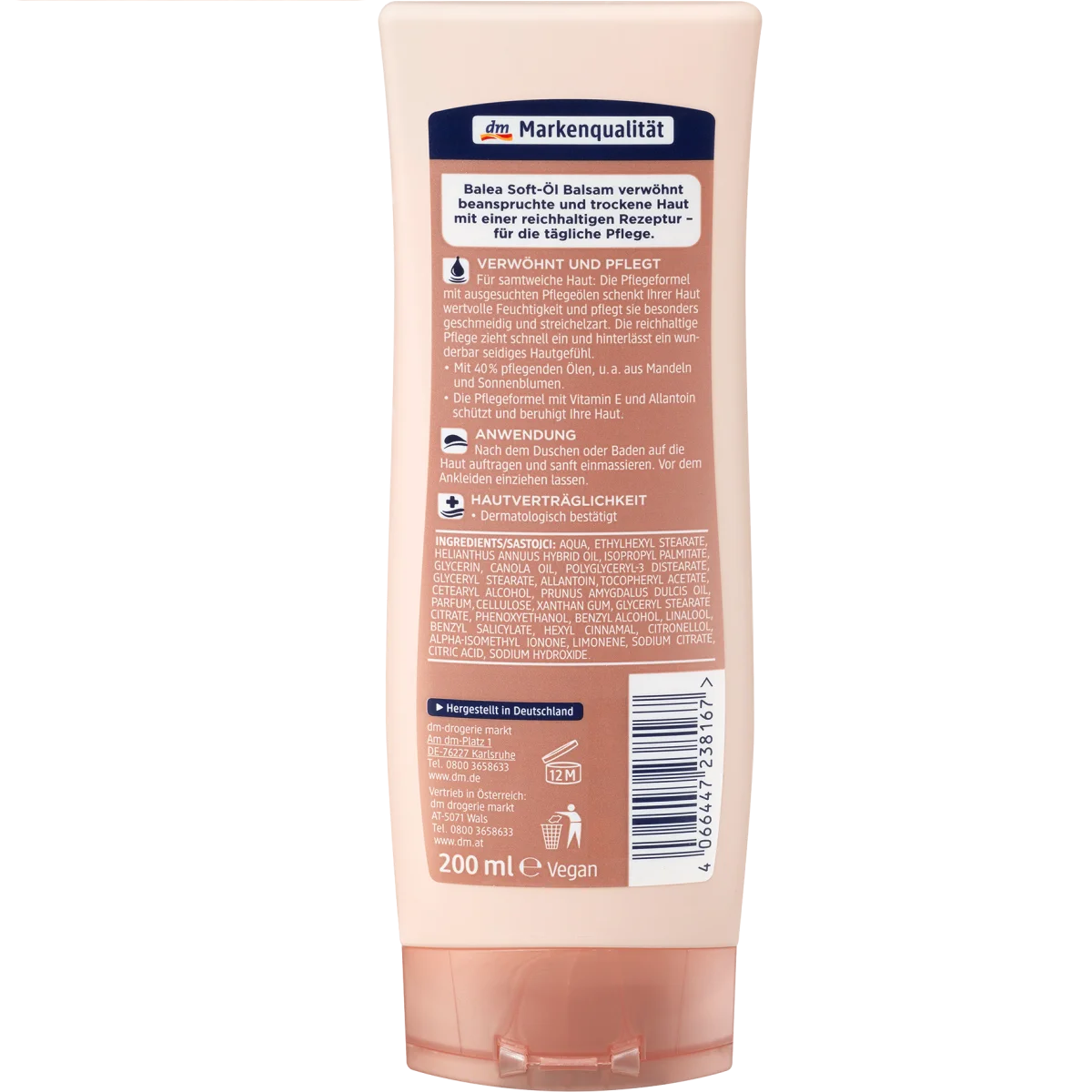 Pour une peau douce et veloutée : le Baume à l’huile Soft de Balea chouchoute les peaux sèches et abîmées avec une formule riche pour le soin quotidien. La formule de soin à base d’huiles de soin sélectionnées offre à votre peau une hydratation précieuse et la rend particulièrement souple et douce comme une caresse. La vitamine E et l’allantoïne protègent et apaisent votre peau. Ce soin riche est rapidement absorbé et laisse une merveilleuse sensation soyeuse sur la peau. Tolérance cutanée confirmée sous contrôle dermatologique.