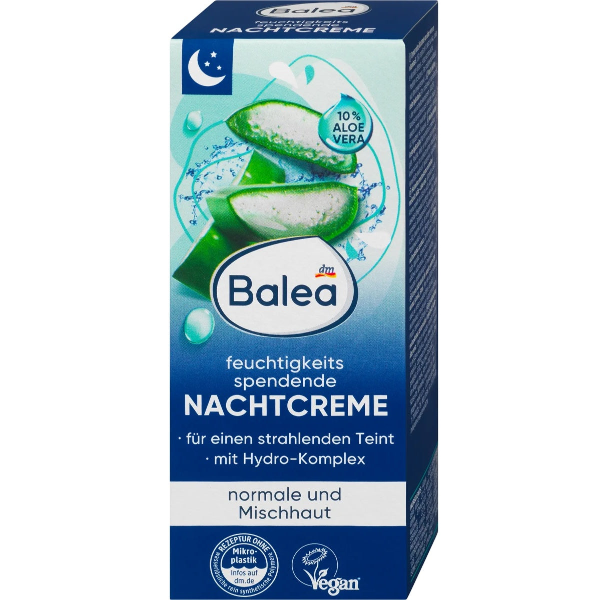 Pour un réveil radieux le matin : la crème de nuit hydratante Balea soutient le processus de régénération nocturne de votre peau. De l’aloe vera précieux et un hydrocomplexe procurent à votre peau une hydratation intense et soutiennent de manière ciblée son équilibre hydrique. La formule de soin à la vitamine E soutient le processus de régénération nocturne de votre peau et la protège contre les radicaux libres. Pour une peau douce et souple. Formule sans microplastiques ni polymères synthétiques purs solubles dans l’eau.