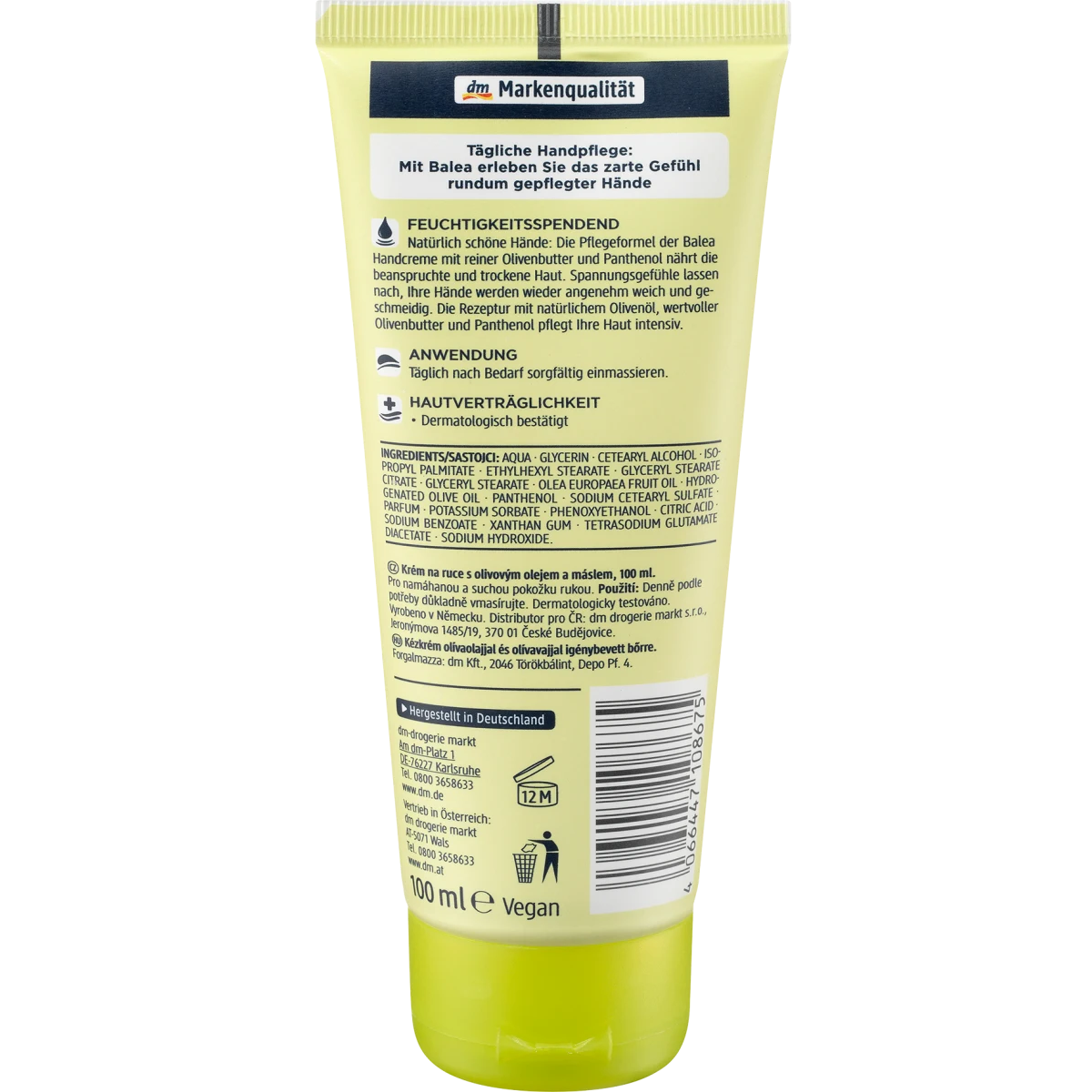 Avec la Crème Mains Olive de Balea, découvrez la douce sensation de mains parfaitement soignées – tous les jours. La formule de soin nourrit la peau sèche et sollicitée. Les sensations de tiraillement diminuent et vos mains retrouvent leur douceur et leur souplesse. La formule à base d’huile d’olive naturelle, de beurre d’olive précieux et de panthénol nourrit intensément votre peau. La formule est en outre végétalienne et fabriquée sans microplastiques ni polymères purement synthétiques solubles dans l’eau.
