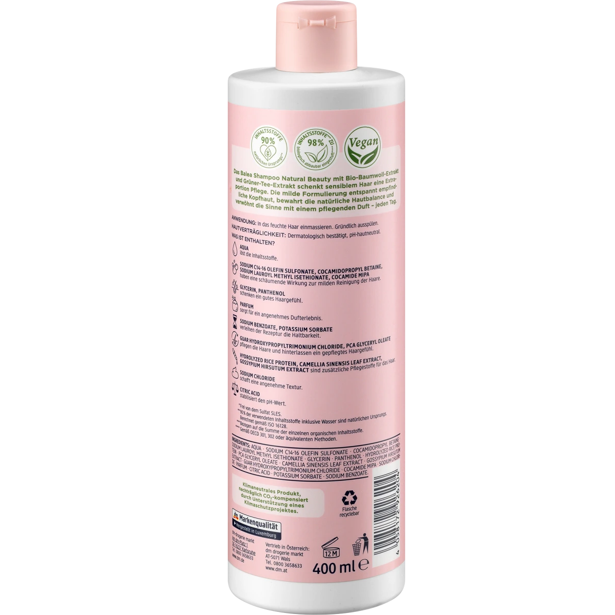 Le shampooing Balea Natural Beauty à l’extrait de coton bio et à l’extrait de thé vert offre aux cheveux sensibles une portion de soin supplémentaire. La formule douce détend le cuir chevelu sensible, préserve l’équilibre naturel de la peau et gâte les sens avec un parfum soignant