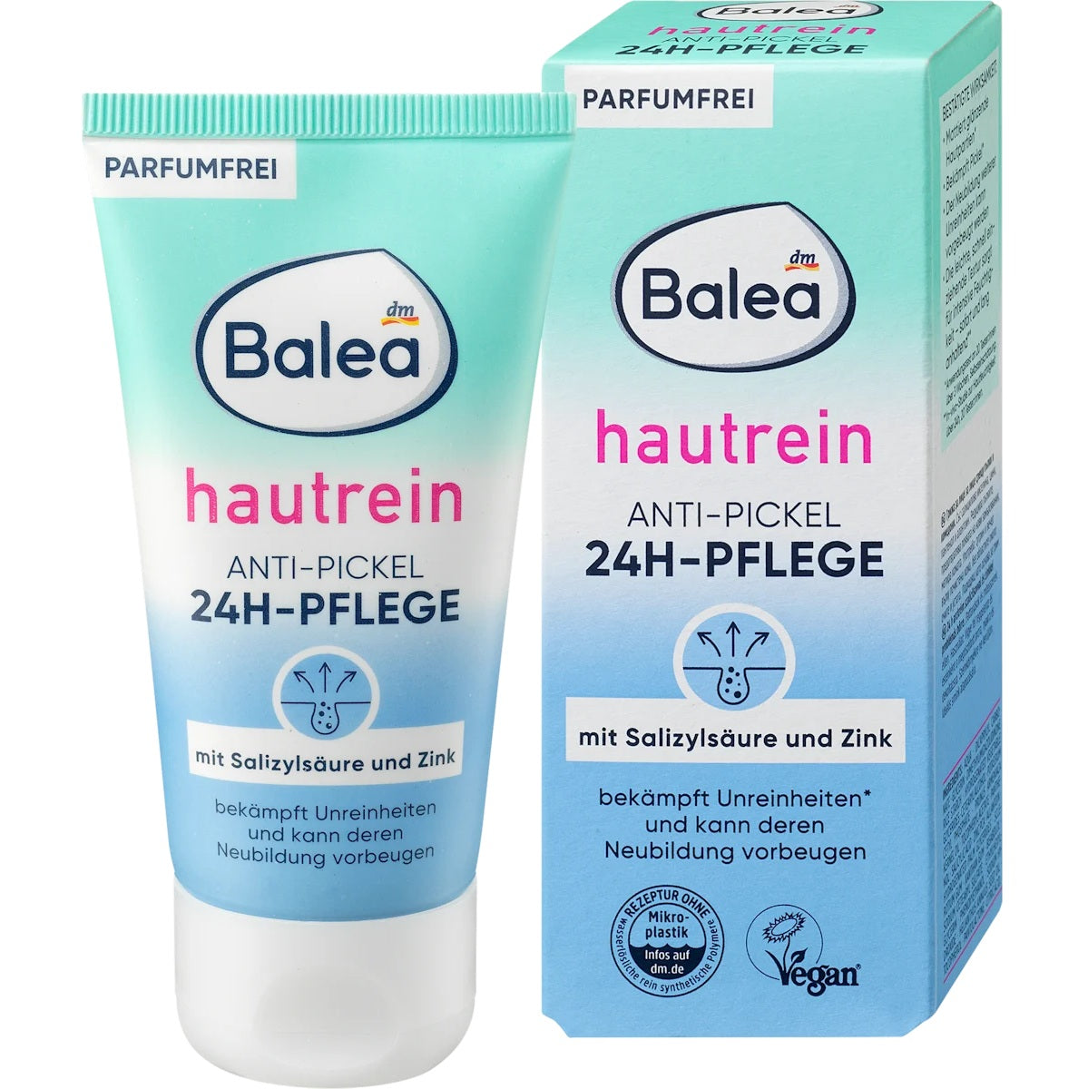 Le soin Peau nette anti-boutons 24h de Balea convient comme soin spécial en cas de boutons et de points noirs. Ce soin du visage permet de lutter contre les impuretés* et de prévenir leur réapparition. Tandis que l’acide salicylique et le zinc aident à combattre les bactéries à l’origine des boutons, le panthénol et l’allantoïne ont des propriétés apaisantes pour la peau. En outre, le soin anti-boutons peut matifier les zones brillantes de la peau*. La texture légère et rapidement absorbée assure une hydratation intense – immédiate et durable**. Formule sans microplastiques ni polymères synthétiques purs solubles dans l’eau.