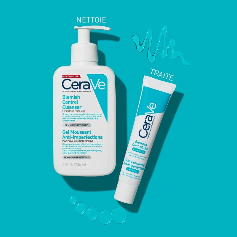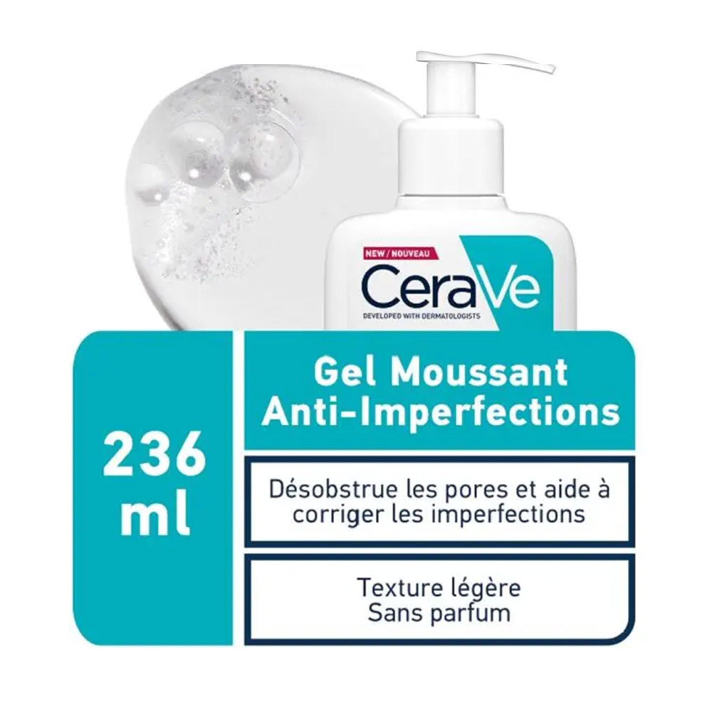 Cerave Gel Nettoyant Moussant, élimine l’excès de sébum sans altérer la barrière protectrice de la peau.