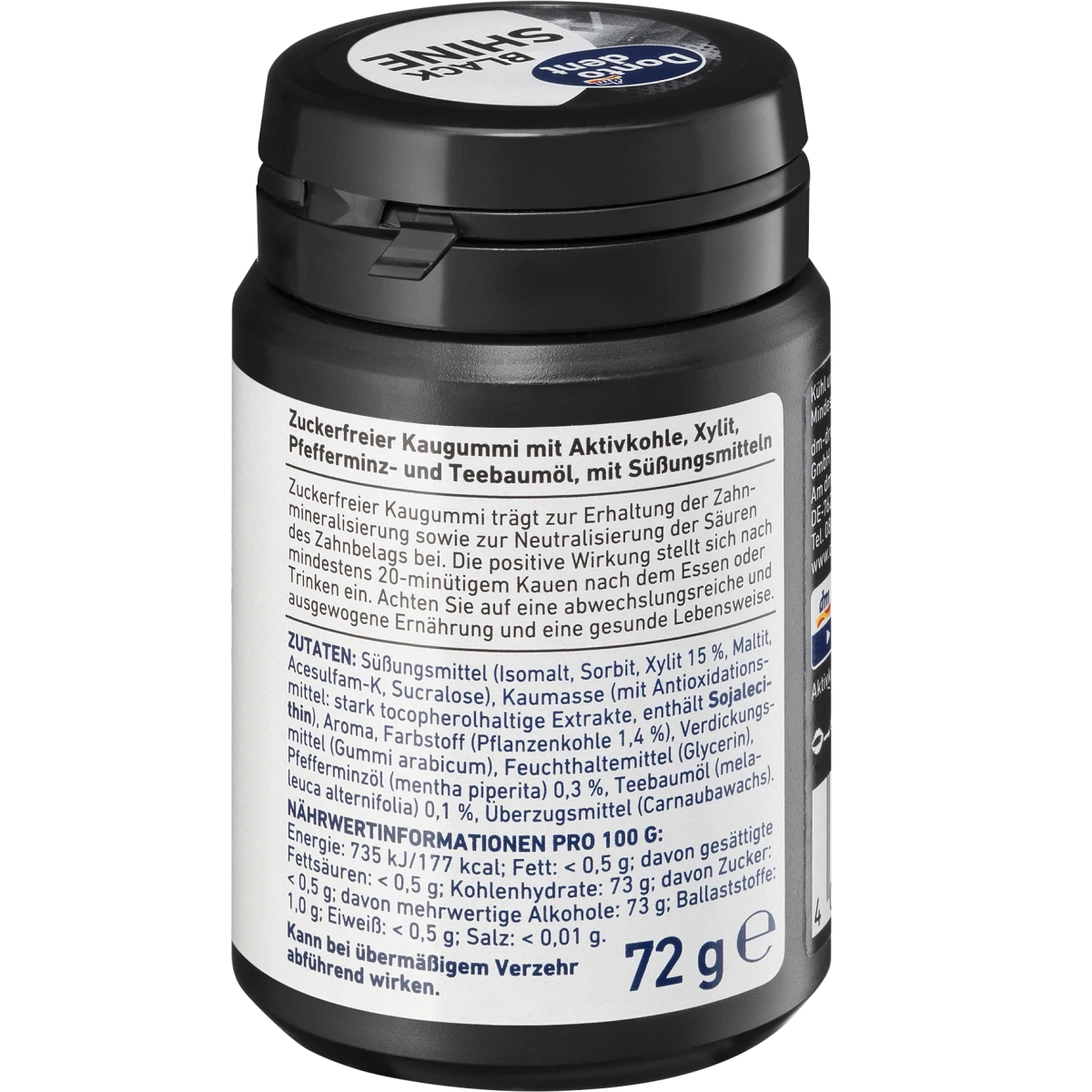Pour un plaisir de mastication rafraîchissant : le chewing-gum Dontodent Black Shine est un produit de qualité suisse. Le chewing-gum au charbon actif, au xylitol, à l’huile de menthe et d’arbre à thé est sans gluten.