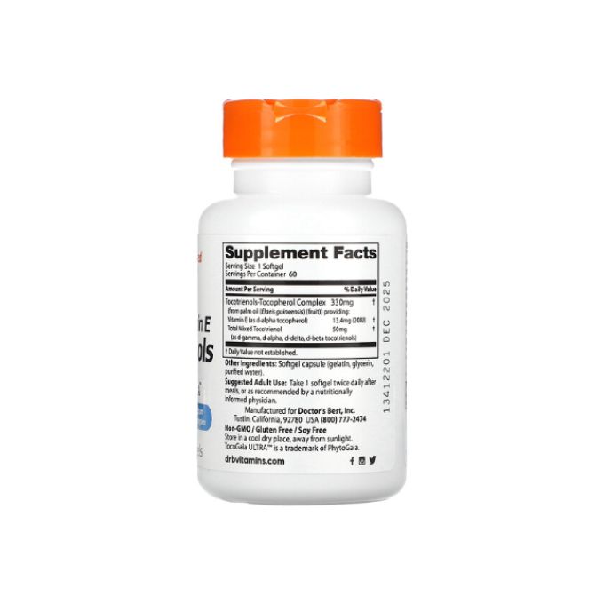 Les tocotriénols de Doctor’s Best contient le complexe de vitamine E à spectre complet EVNol SupraBio®. Fabriquée à partir d’huile de palme rouge produite de manière durable, cette préparation est uniquement auto-émulsifiante pour une absorption efficace. Il élève les tocotriénols dans le sang, le cerveau, le cœur, le foie et la peau tout en préservant les niveaux d’alpha-tocophérol. Cette préparation unique améliore également la fonction de la paroi des vaisseaux sanguins et aide à maintenir des taux de cholestérol sains dans les limites de la normale.