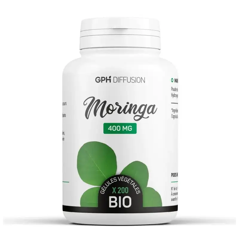 Ingrédients pour 1 gélule de Moringa : Poudre de Moringa* (moringa oleifera) non titrée 400 mg, cellulose 90 mg.