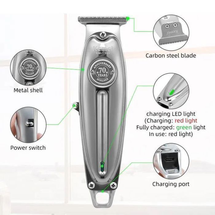 La tondeuse Kemei KM-1949 est petite, ergonomique et professionnelle, avec son boîtier métallique. De plus, ce modèle a une finition plus élégante car c’est une édition 70e anniversaire de la marque.
