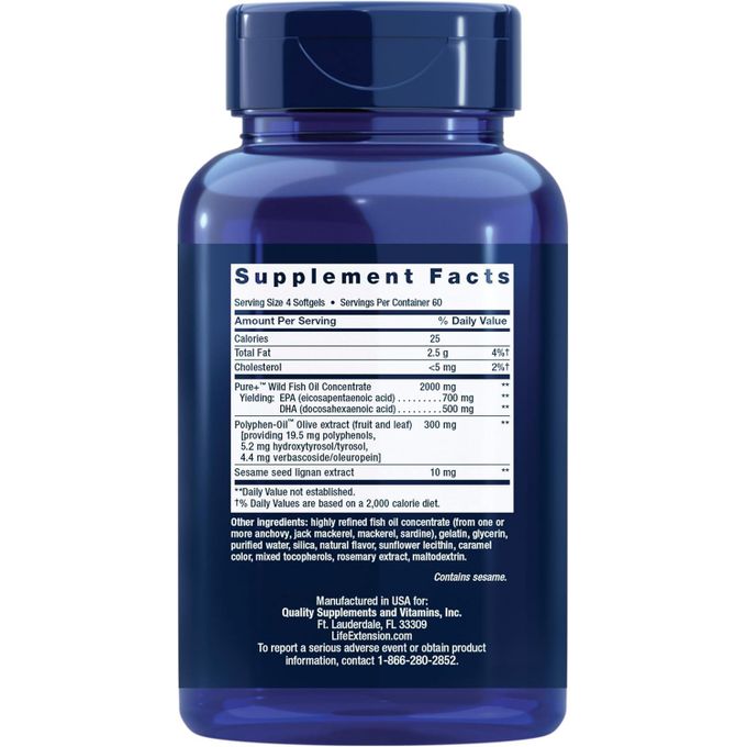 Notre formule Super Omega-3 EPA/DHA est fabriquée avec une huile de poisson certifiée IFOS™ qui fournit des acides gras EPA et DHA pour favoriser la santé cardiaque, la santé du cerveau et plus encore. Notre formule Super Omega-3 est enrichie en polyphénols issus d’extrait d’olive et en lignanes de sésame.