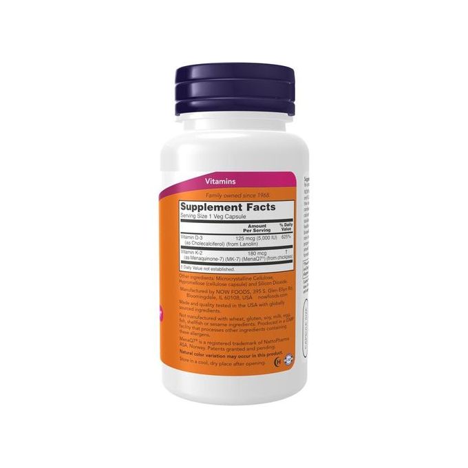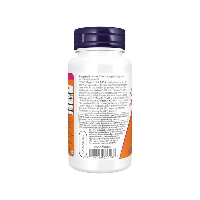 Mega D-3 & MK-7 de NOW® combine les vitamines D3 et K2, deux nutriments dont les rôles dans la santé des os, des dents et du système cardiovasculaire ont été étudiés de façon extensive. La vitamine D3 fonctionne avec le calcium pour soutenir la santé des os. Des études plus récentes indiquent qu’elle est également importante pour la santé du système immunitaire. MK-7 de MenaQ7® est une forme unique, biodisponible et sans soja de vitamine K2. Grâce à sa capacité à soutenir le bon métabolisme calcique dans les artères et les vaisseaux sanguins, elle joue un rôle essentiel dans la santé des artères. La vitamine K2 est également importante pour la formation d’os solides et en bonne santé.