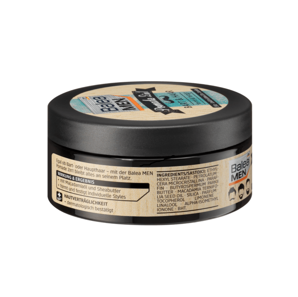Qu’il s’agisse de la barbe ou des cheveux principaux, tout reste à sa place avec la pommade 2en1 de Balea MEN. Avec de l’huile de macadamia et du beurre de karité. Forme et raffermit les styles individuels. Formule sans microplastiques ni polymères purement synthétiques solubles dans l’eau.