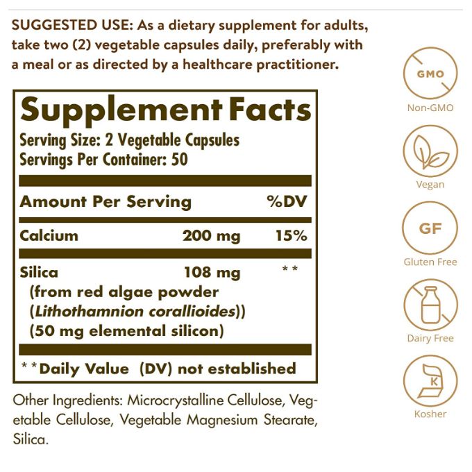 Obtenue à partir de la poudre d’algues rouges d’origine marine (Lithothamnion corallioides), la silice est une source de silicium, un oligo-élément naturel. Le silicium se trouve dans de nombreuses céréales brutes et dans certains fruits de mer, y compris les moules. L’apport en silicium a été positivement associé à la santé des os.