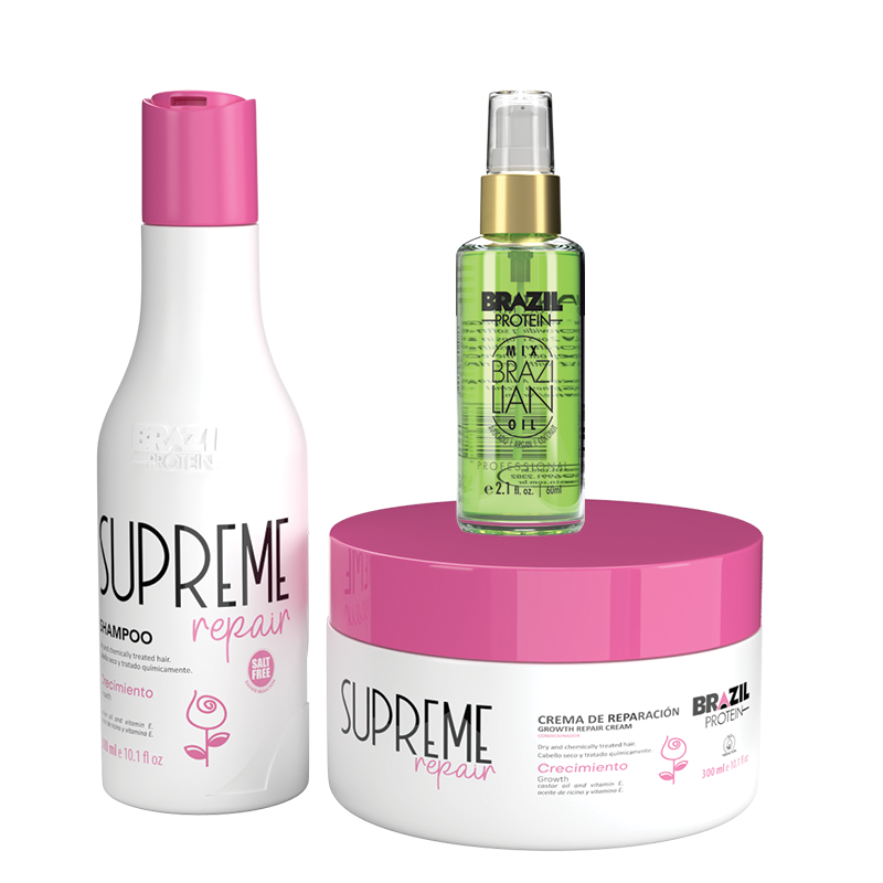 La gamme Supreme Rapair Brazil Protein favorise la revitalisation et l’hydratation des mèches. Maintient la durabilité des produits chimiques. Riche en Vitamine B, E, Oméga 7 et Sélénium, substances qui, ensemble, renforcent et forment un bouclier capillaire anti-radicalaire libre. Mélange de nutriments revitalisants, d’élastine et de collagène. Diminue et/ou stoppe la cassure des mèches. Aide à la résistance des cheveux. Anti-casse, anti-caoutchouc et anti-frisottis