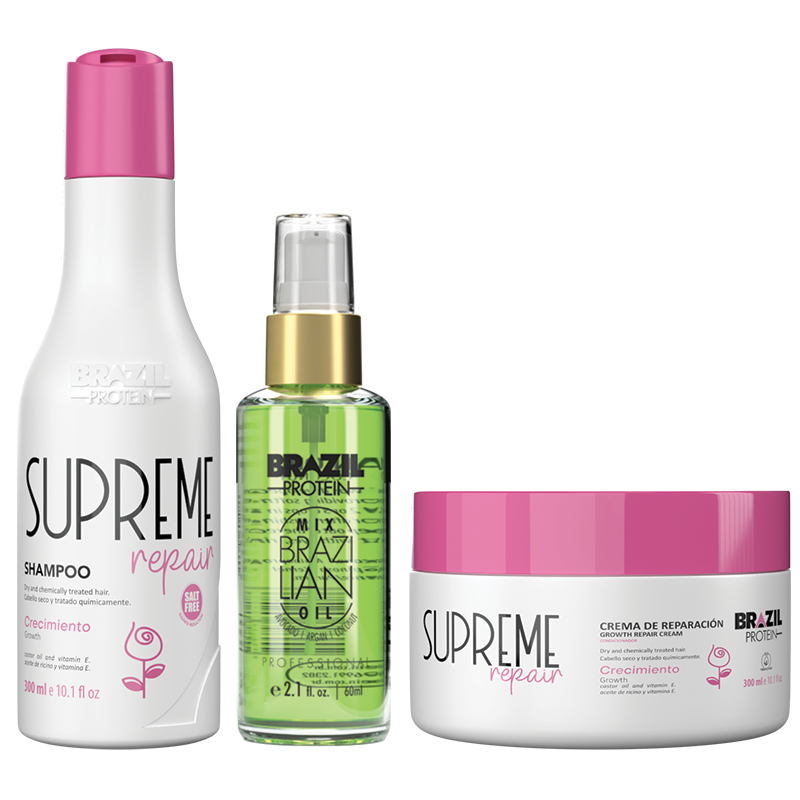 La gamme Supreme Rapair Brazil Protein favorise la revitalisation et l’hydratation des mèches. Maintient la durabilité des produits chimiques. Riche en Vitamine B, E, Oméga 7 et Sélénium, substances qui, ensemble, renforcent et forment un bouclier capillaire anti-radicalaire libre. Mélange de nutriments revitalisants, d’élastine et de collagène. Diminue et/ou stoppe la cassure des mèches. Aide à la résistance des cheveux. Anti-casse, anti-caoutchouc et anti-frisottis
